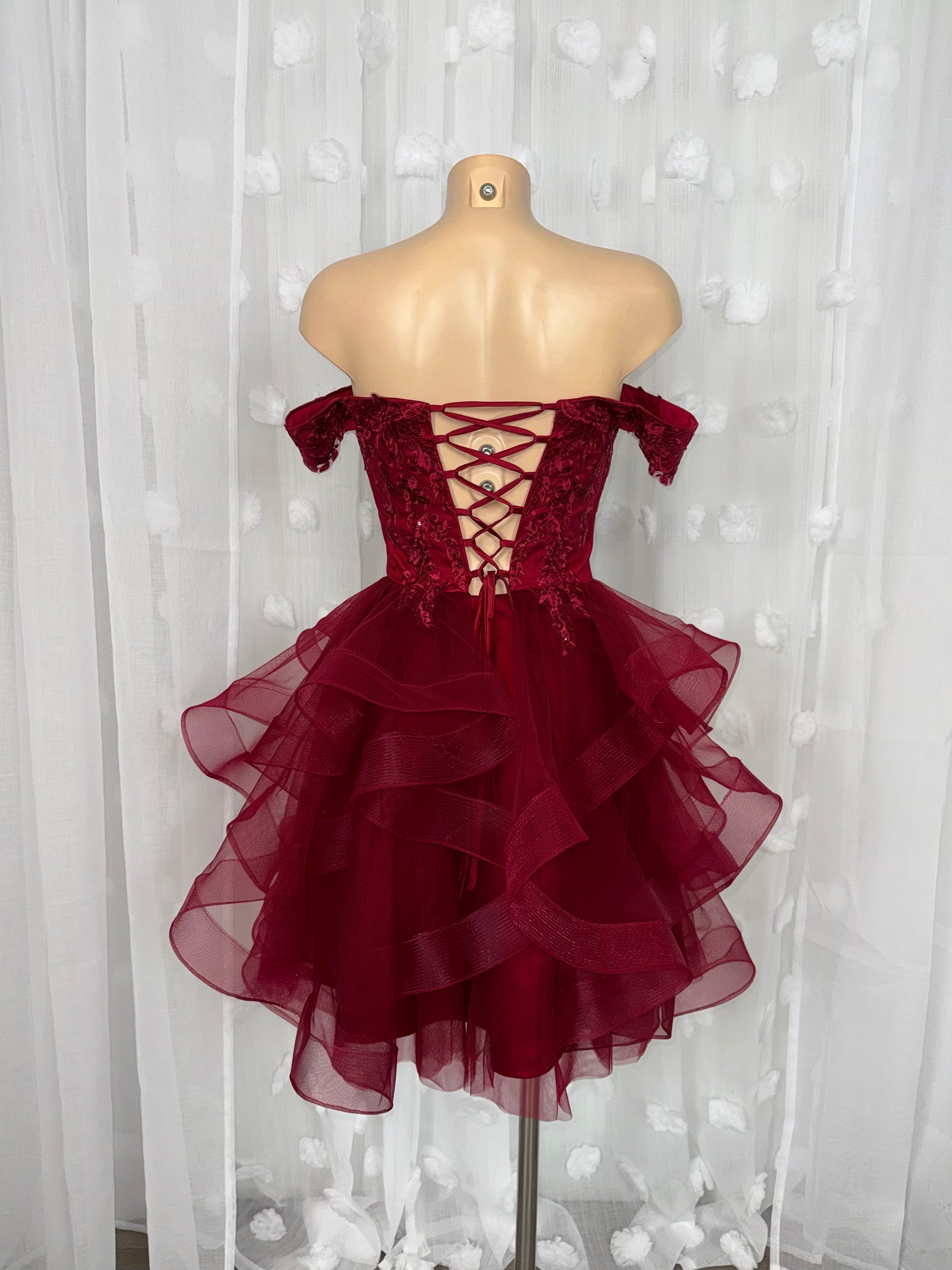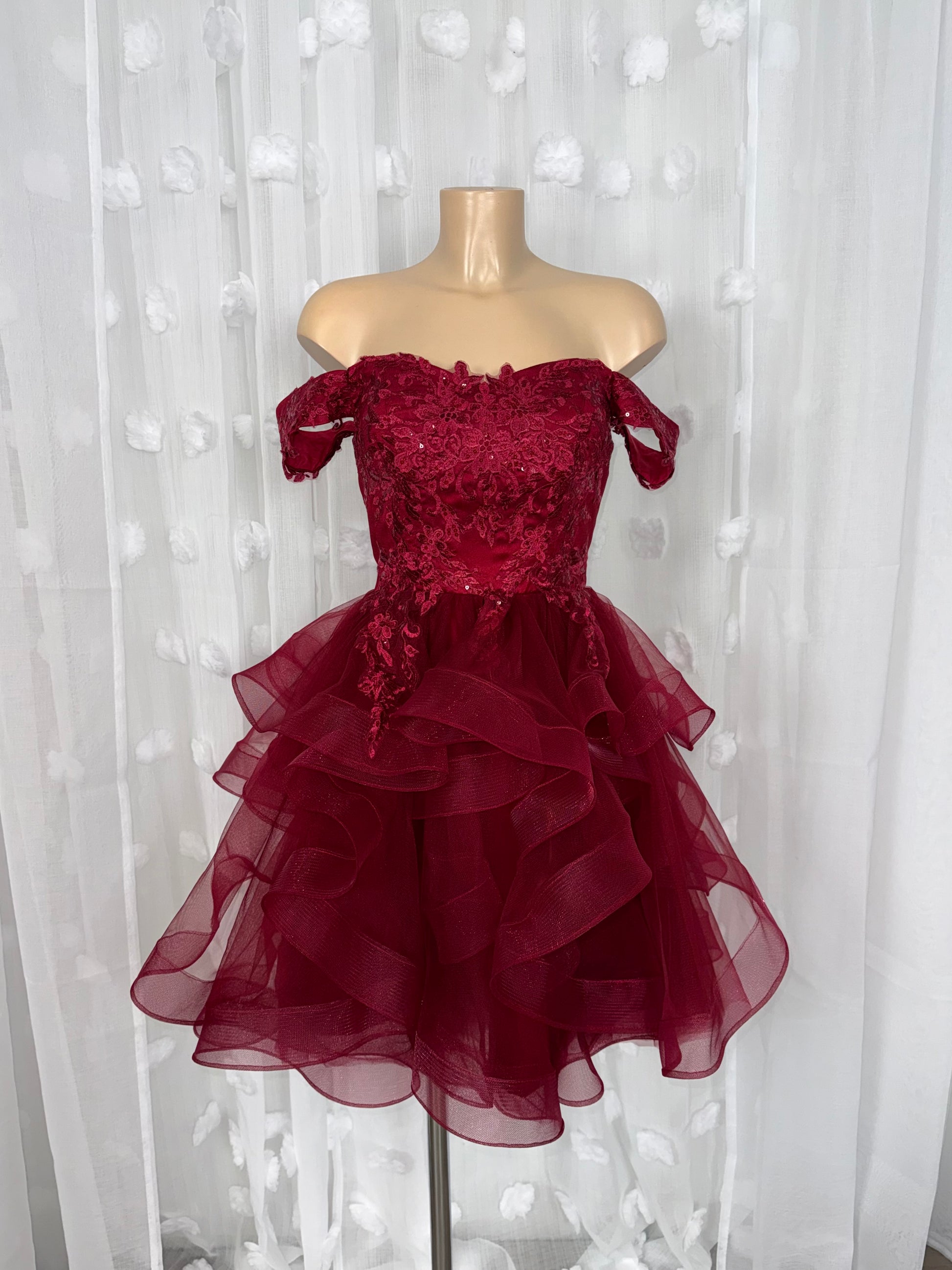 Oman röyhelömallistomme upea uutuus! Celindassa on näyttävä röyhelöhelma, ja yläosassa kiilteleviä pitsikoristeita. Off-shoulder -tyyliset olkaimet sekä selässä avoin nyöritys.