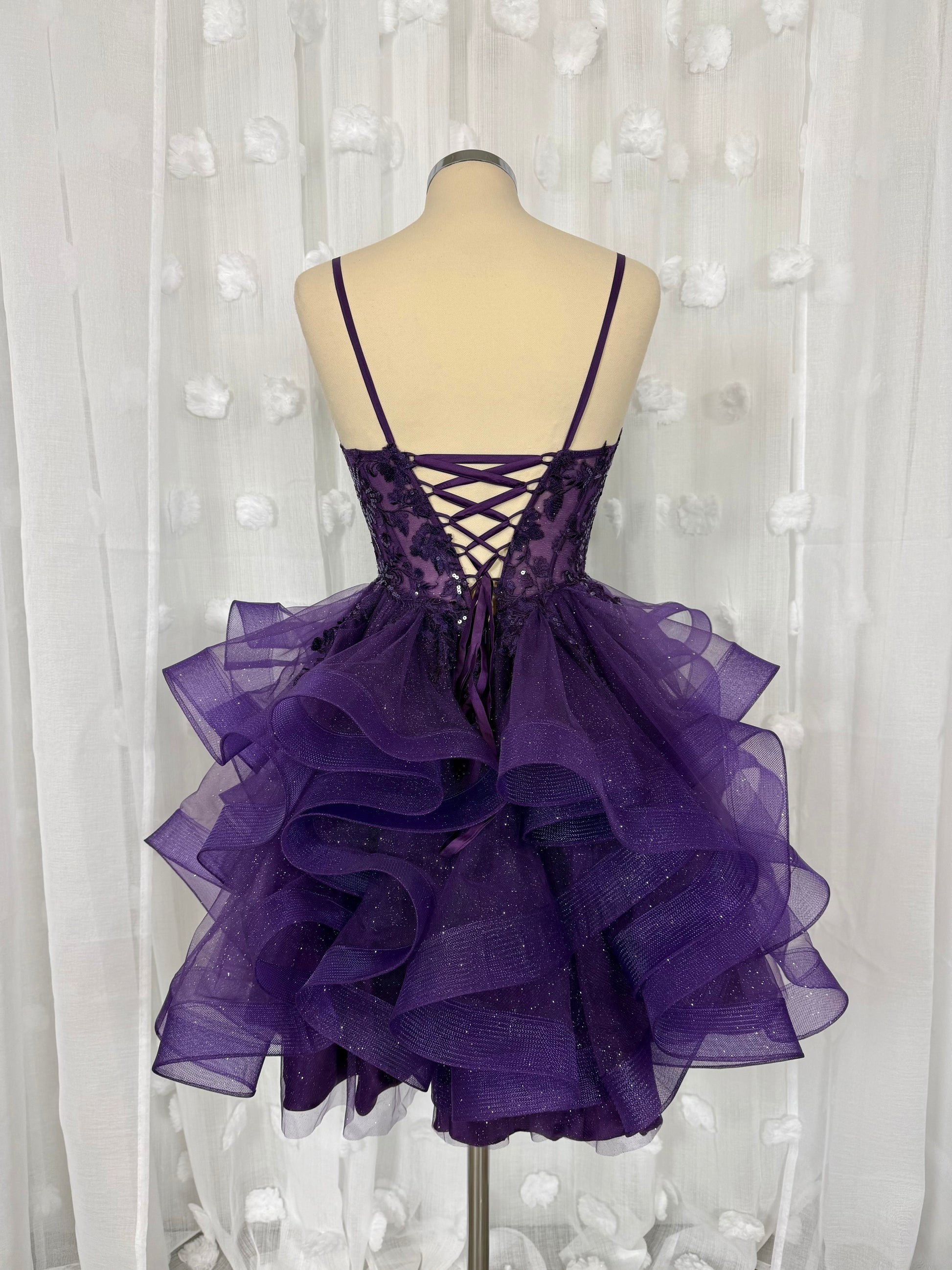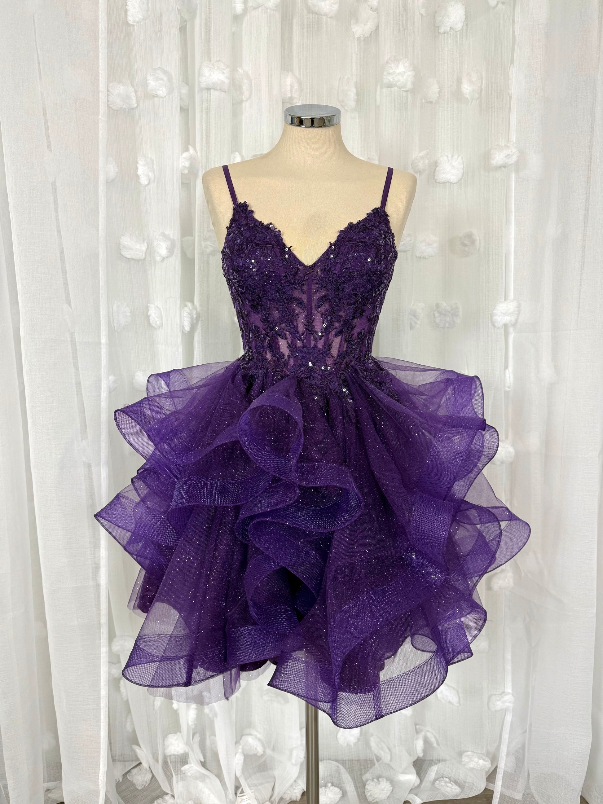 Röyhelömekko korsettimaisella ja koristeellisella yläosalla. Helma kimaltavaa tylliä ja selässä avoin nyöritys.