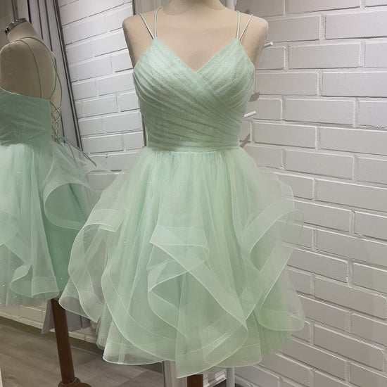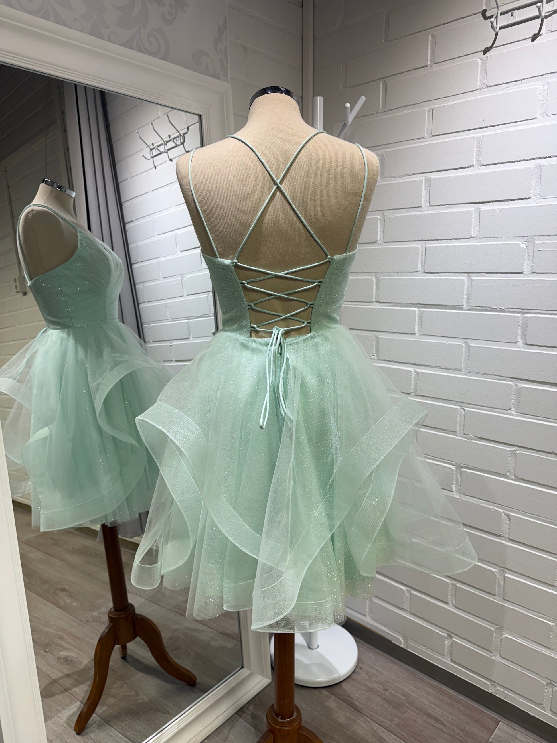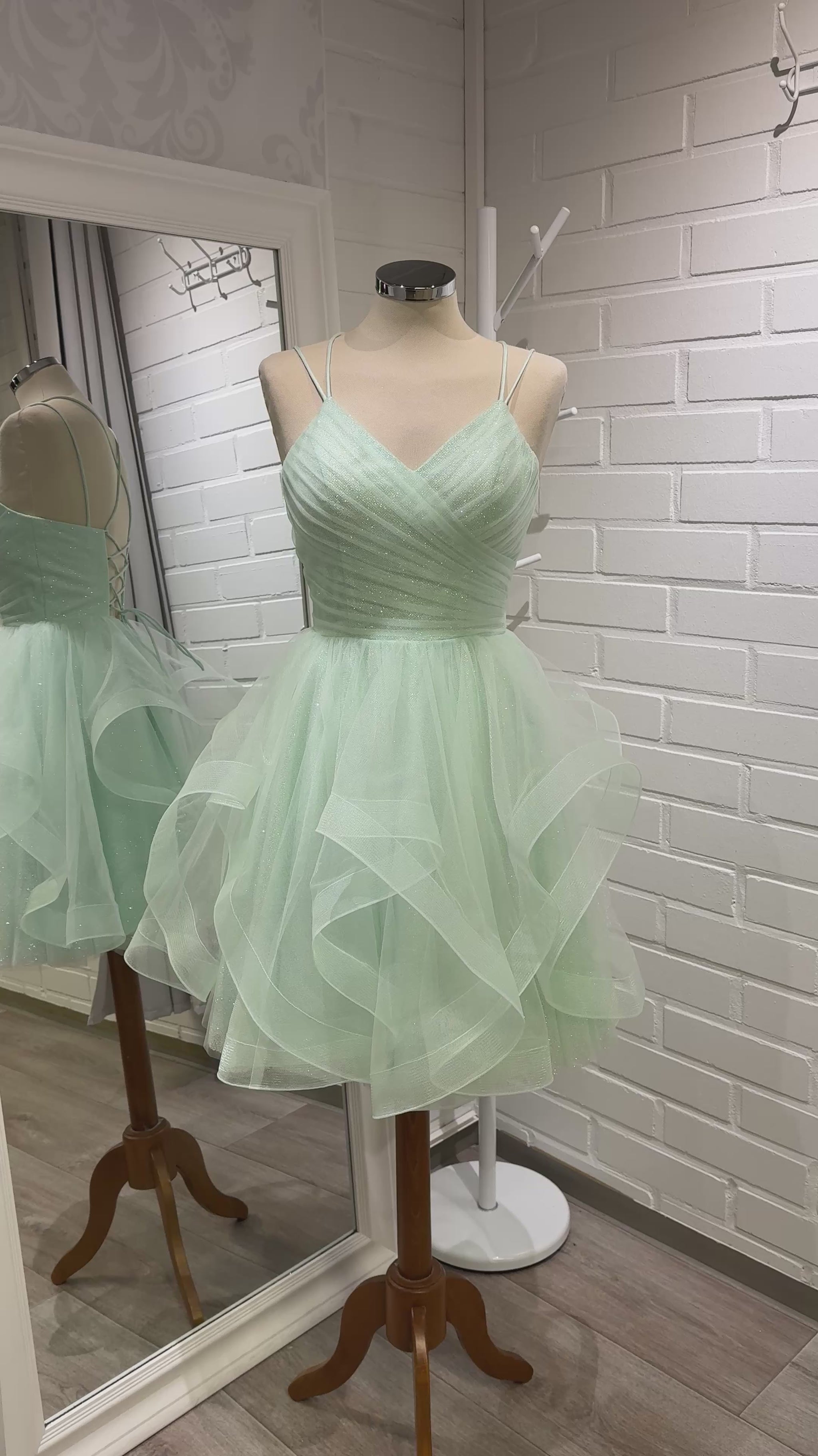 Dazzling Zazabella -malliston kimalteleva röyhelömekko kauniisti laskostetulla yläosalla ja tuplaolkaimilla. Selässä avoin nyöritys.