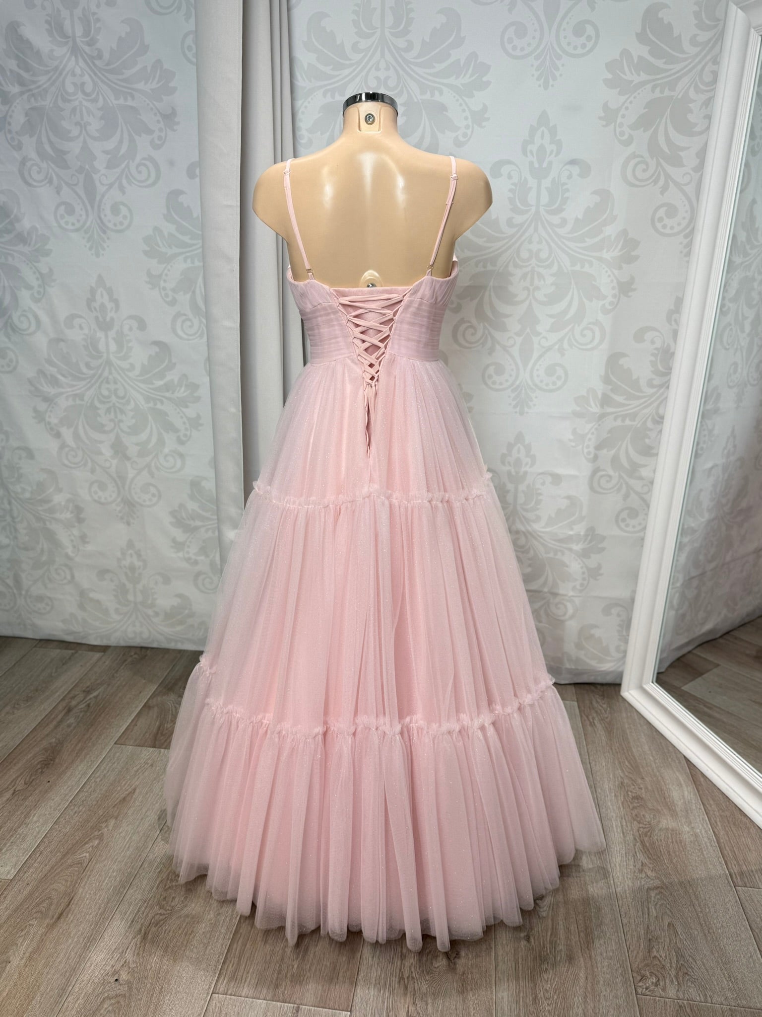 Salsahelmainen vanhojentanssimekko kimalletyllillä. Selässä nyörikiinnitys.
