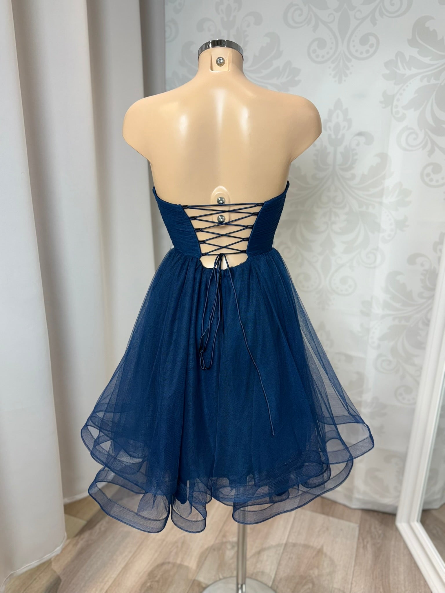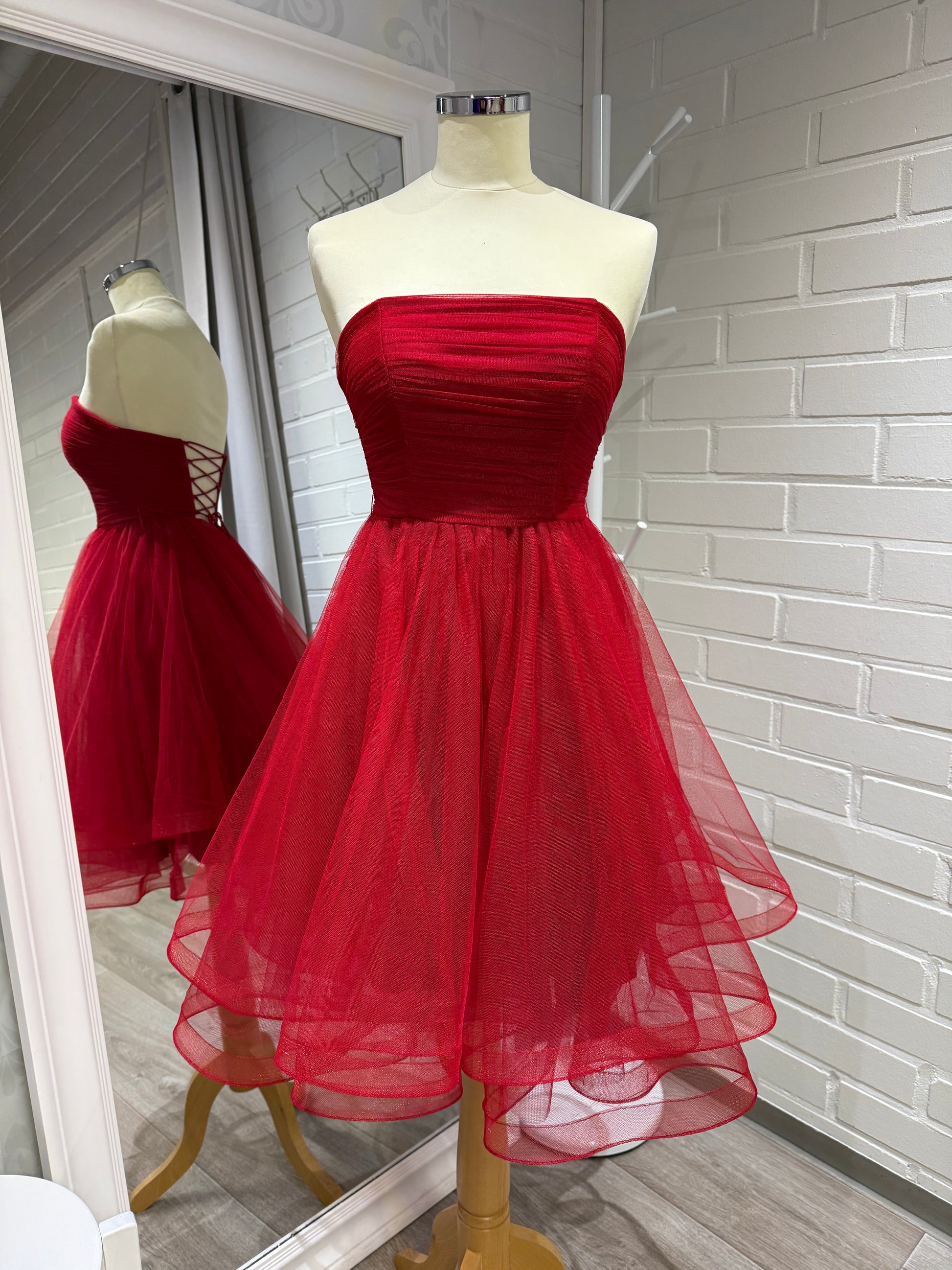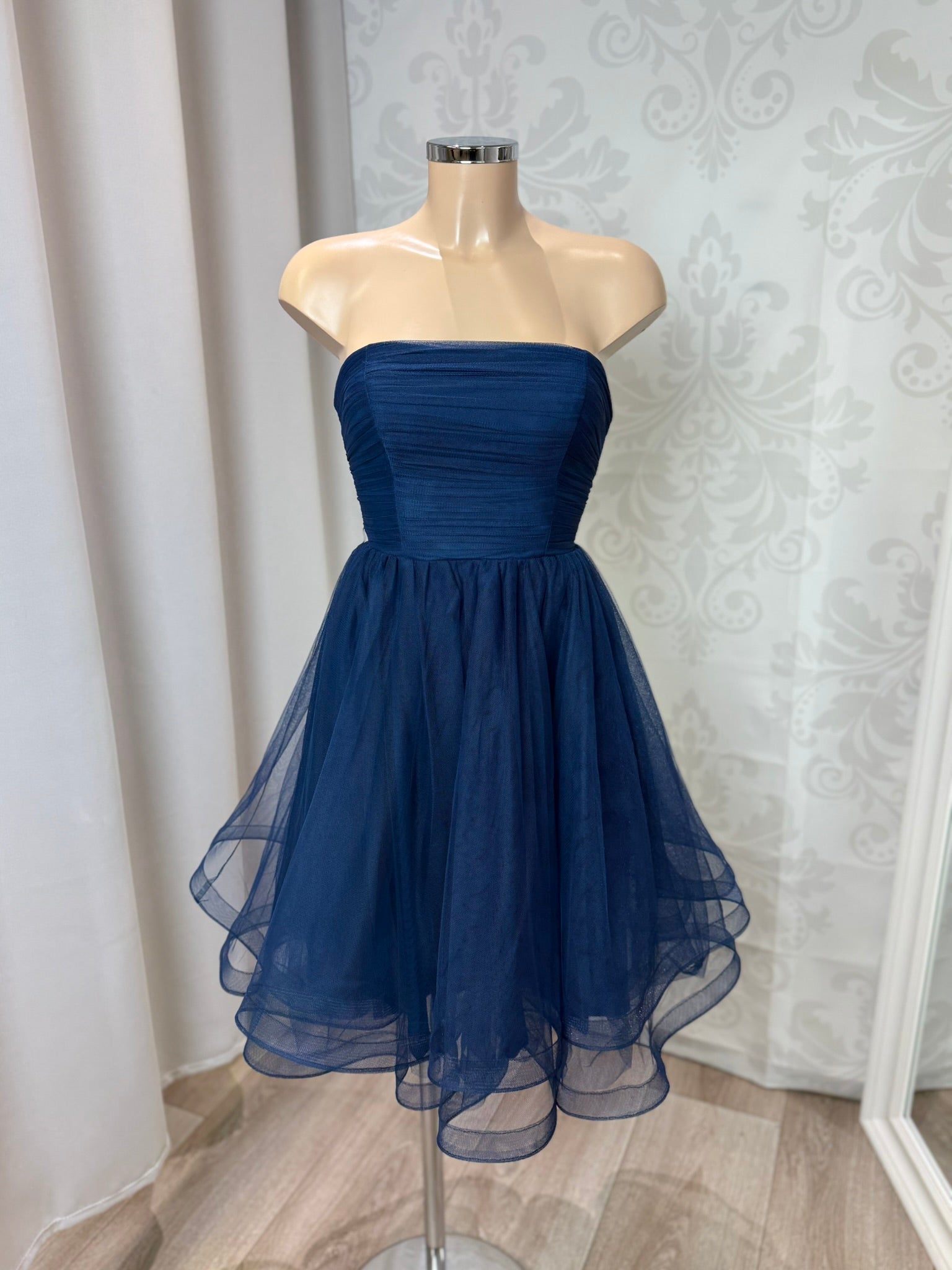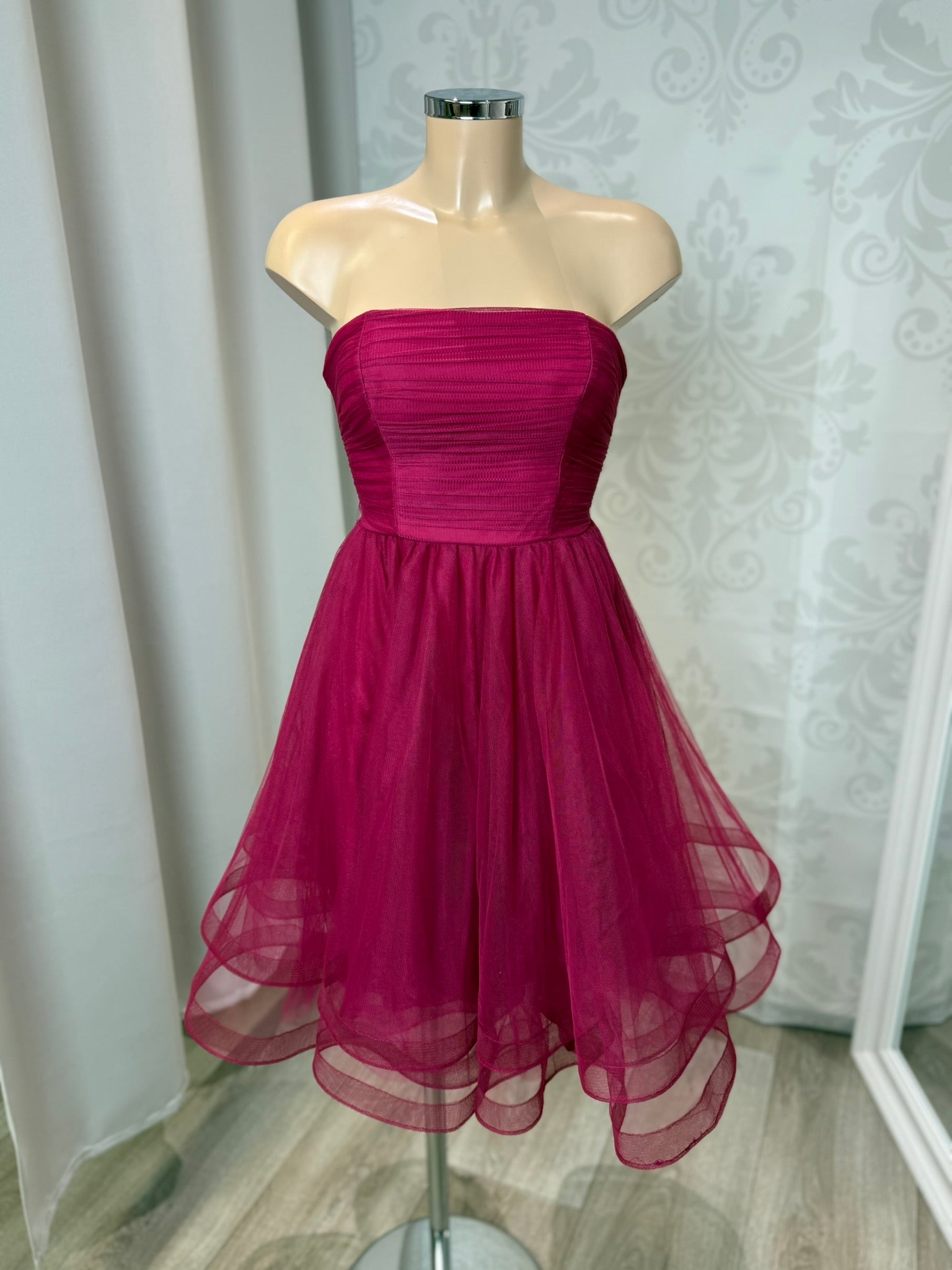 Olkaimeton juhlamekko suoralla pääntiellä ja avoimella nyörityksellä. Helmassa röyhelökerroksia.