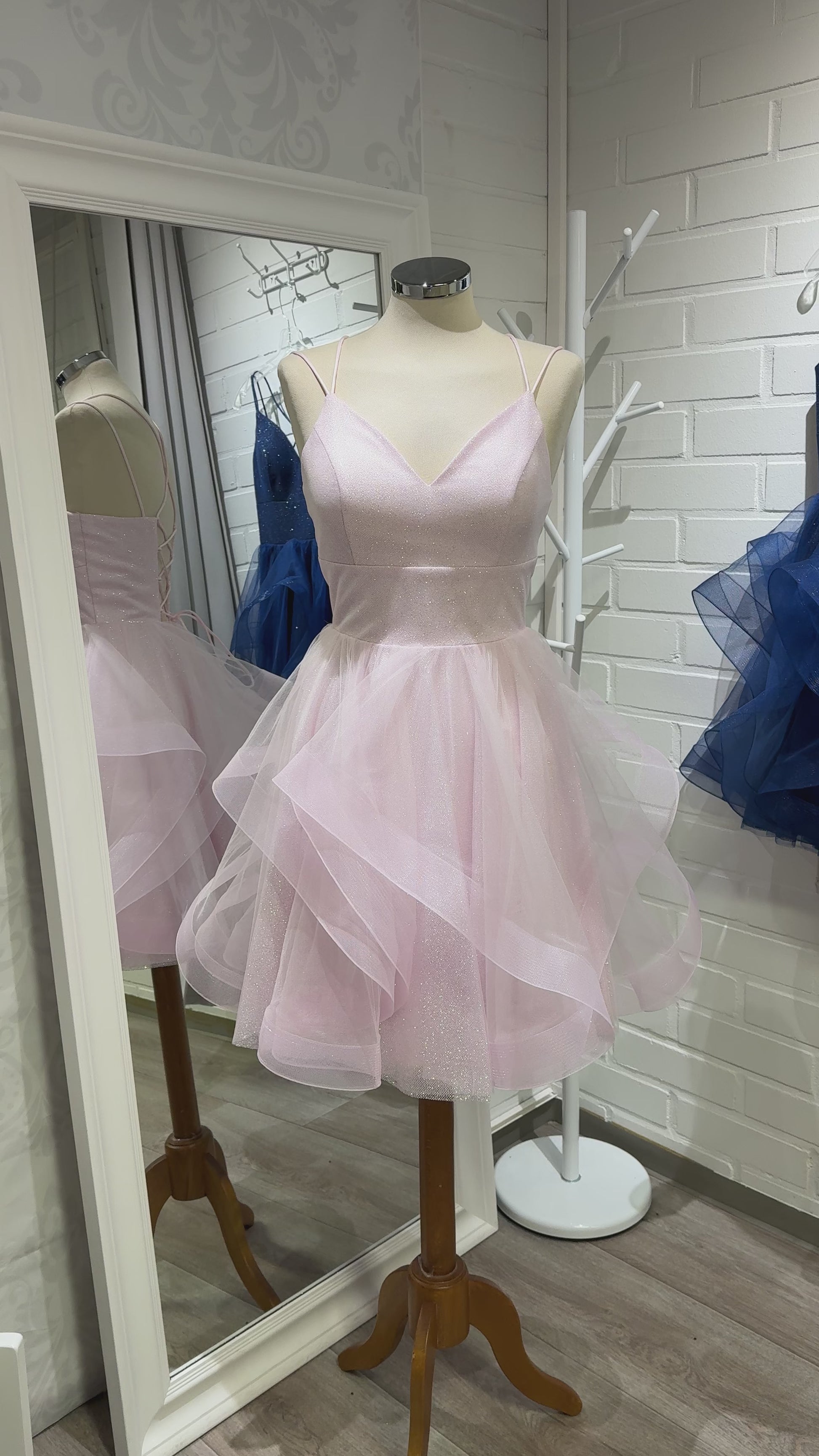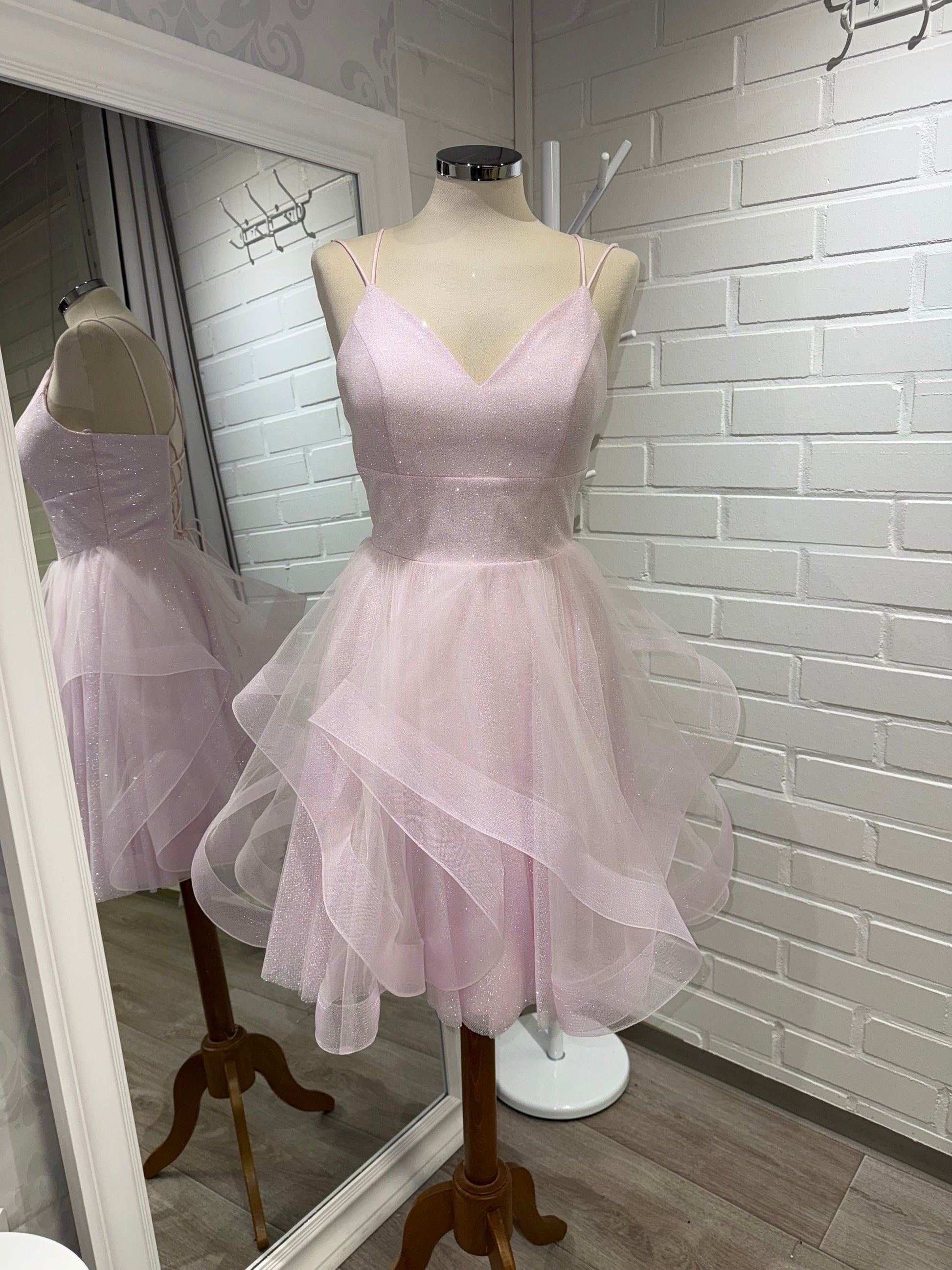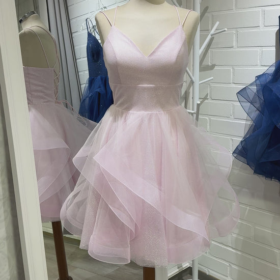 Dazzling Zazabella -malliston kimallekankainen röyhelömekko V-pääntiellä. Yläosassa tuplaolkaimet ja selässä avoin nyöritys.
