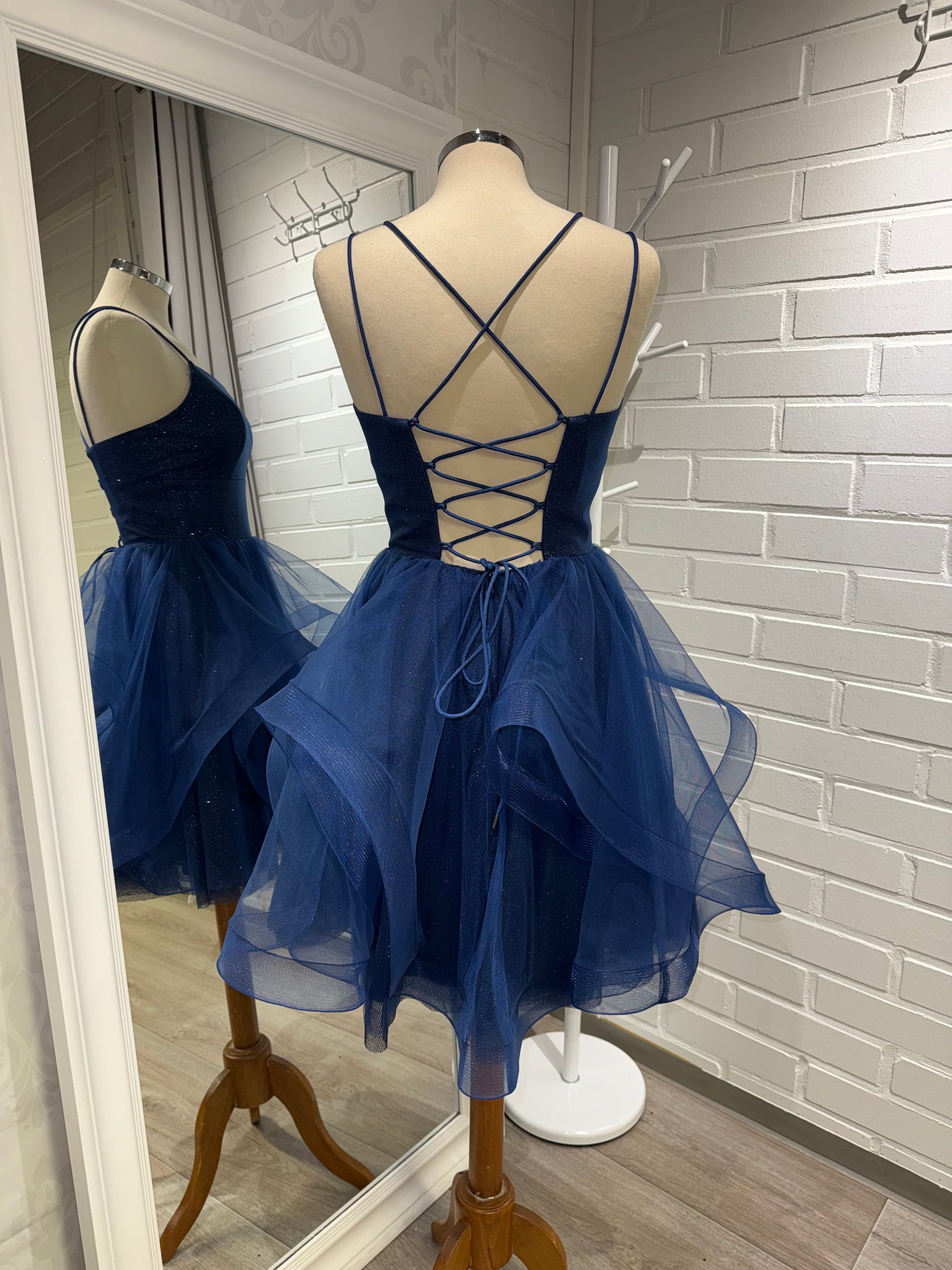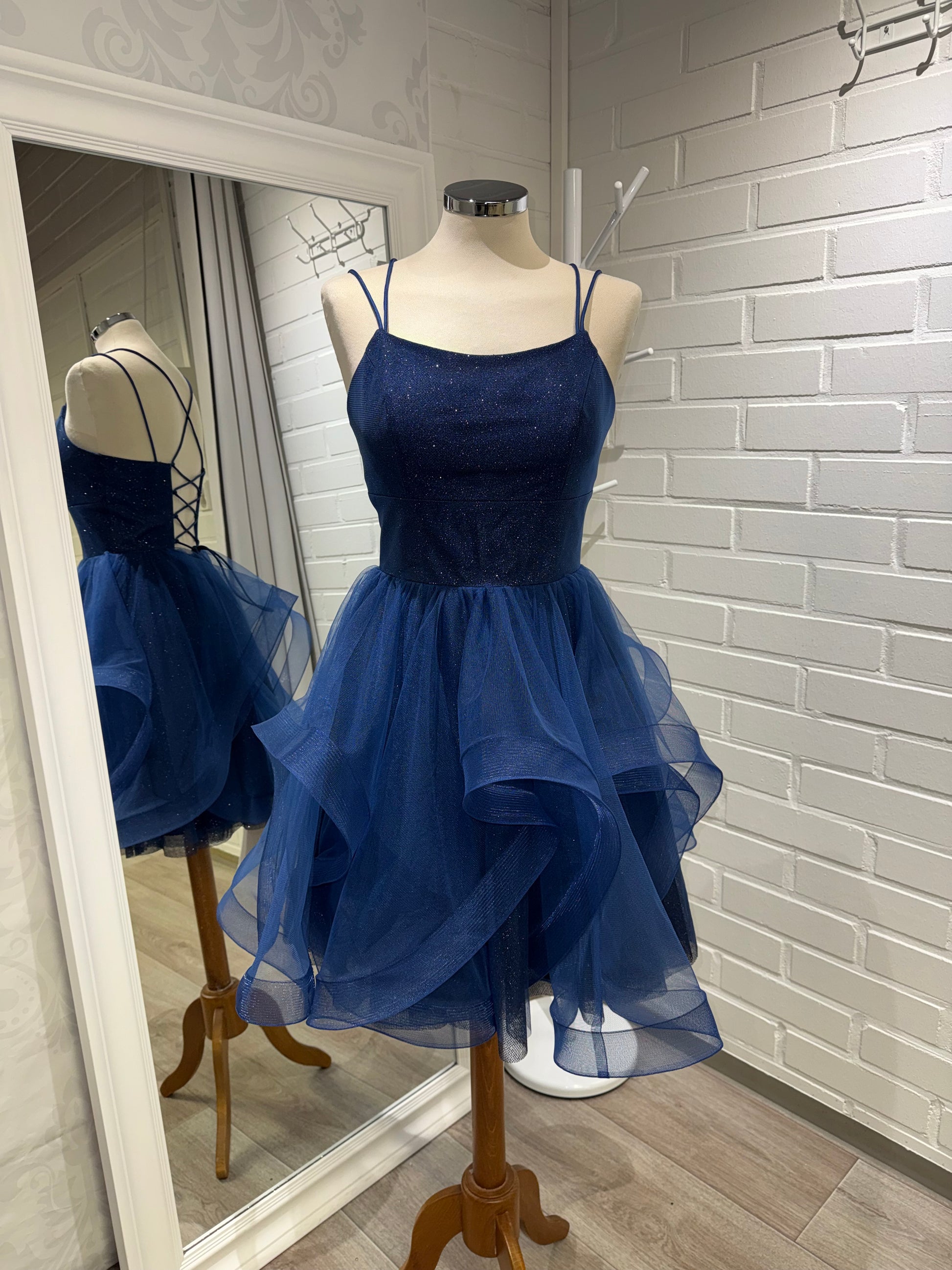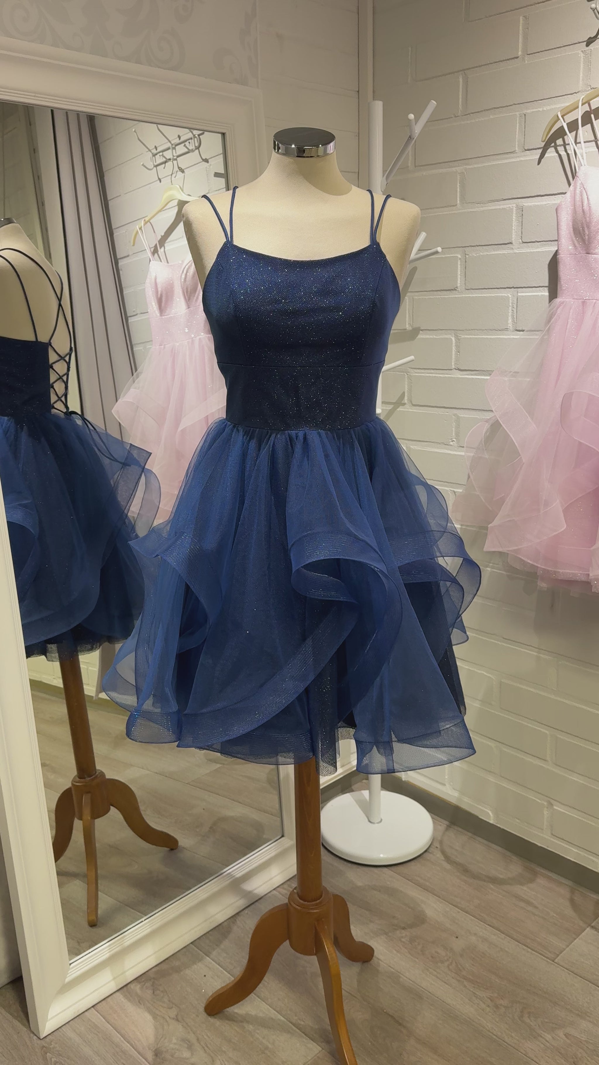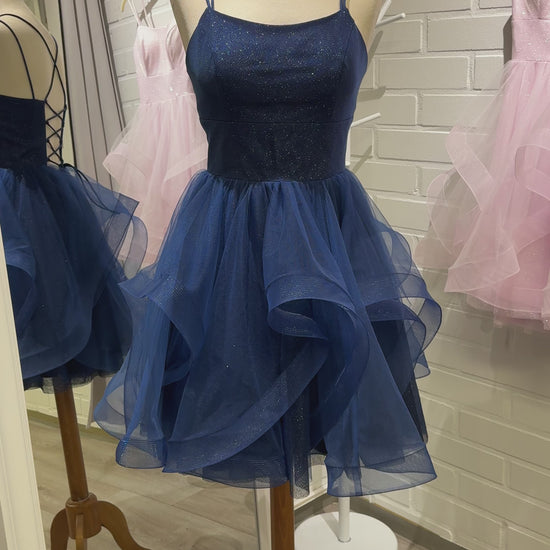 Dazzling Zazabella -malliston kimallekankainen röyhelömekko suoralla pääntiellä. Yläosassa tuplaolkaimet ja selässä avoin nyöritys.