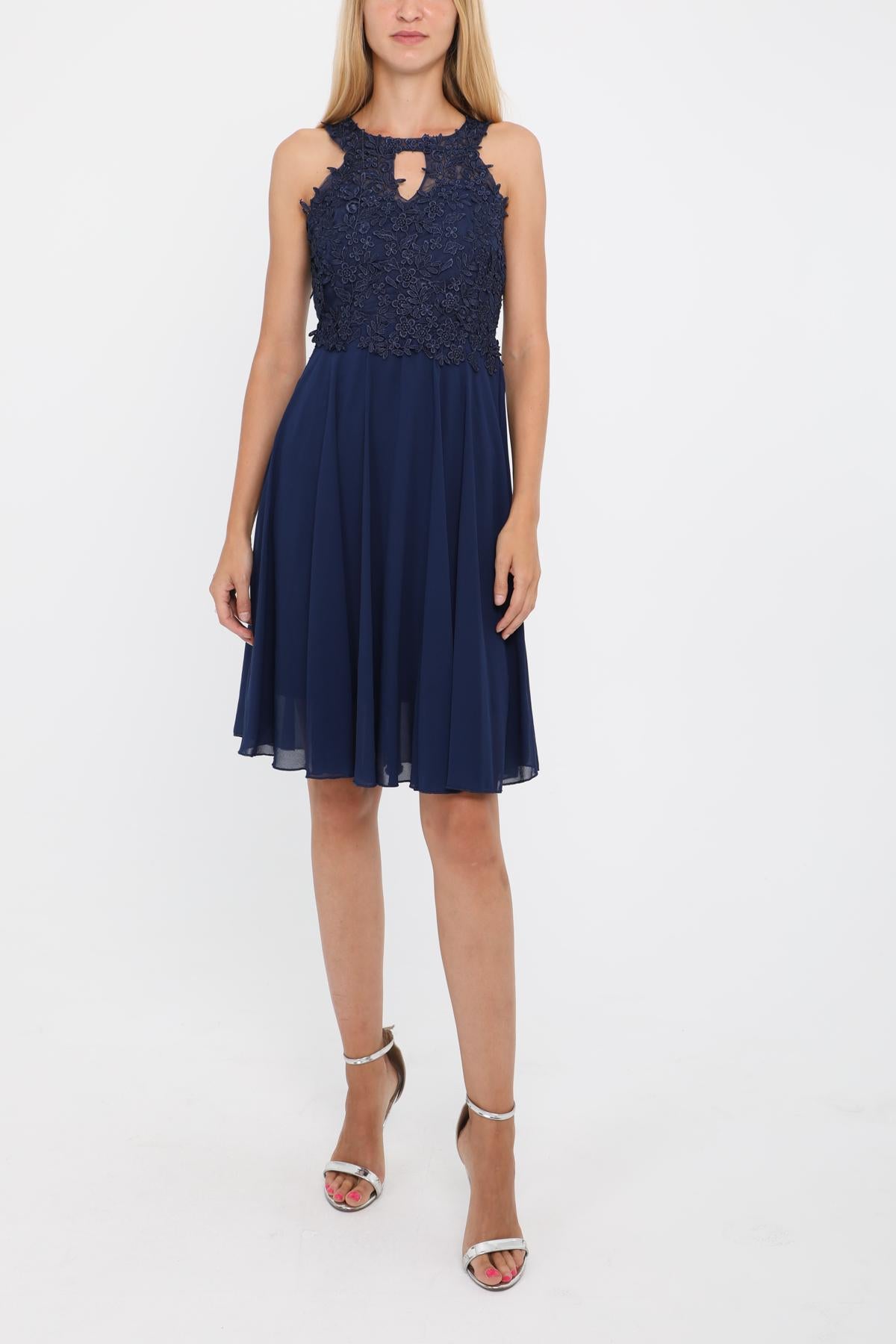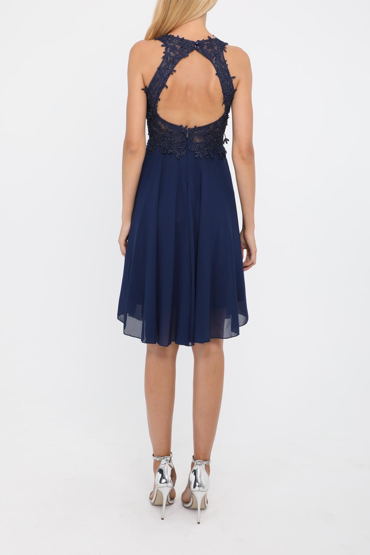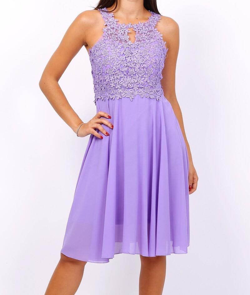 Sifonkihelmainen juhlamekko korkealla pääntiellä ja pitsikoristeilla. Selässä vetoketjukiinnitys.